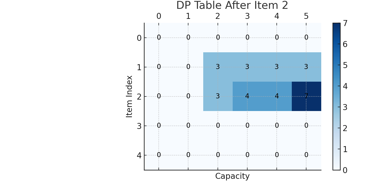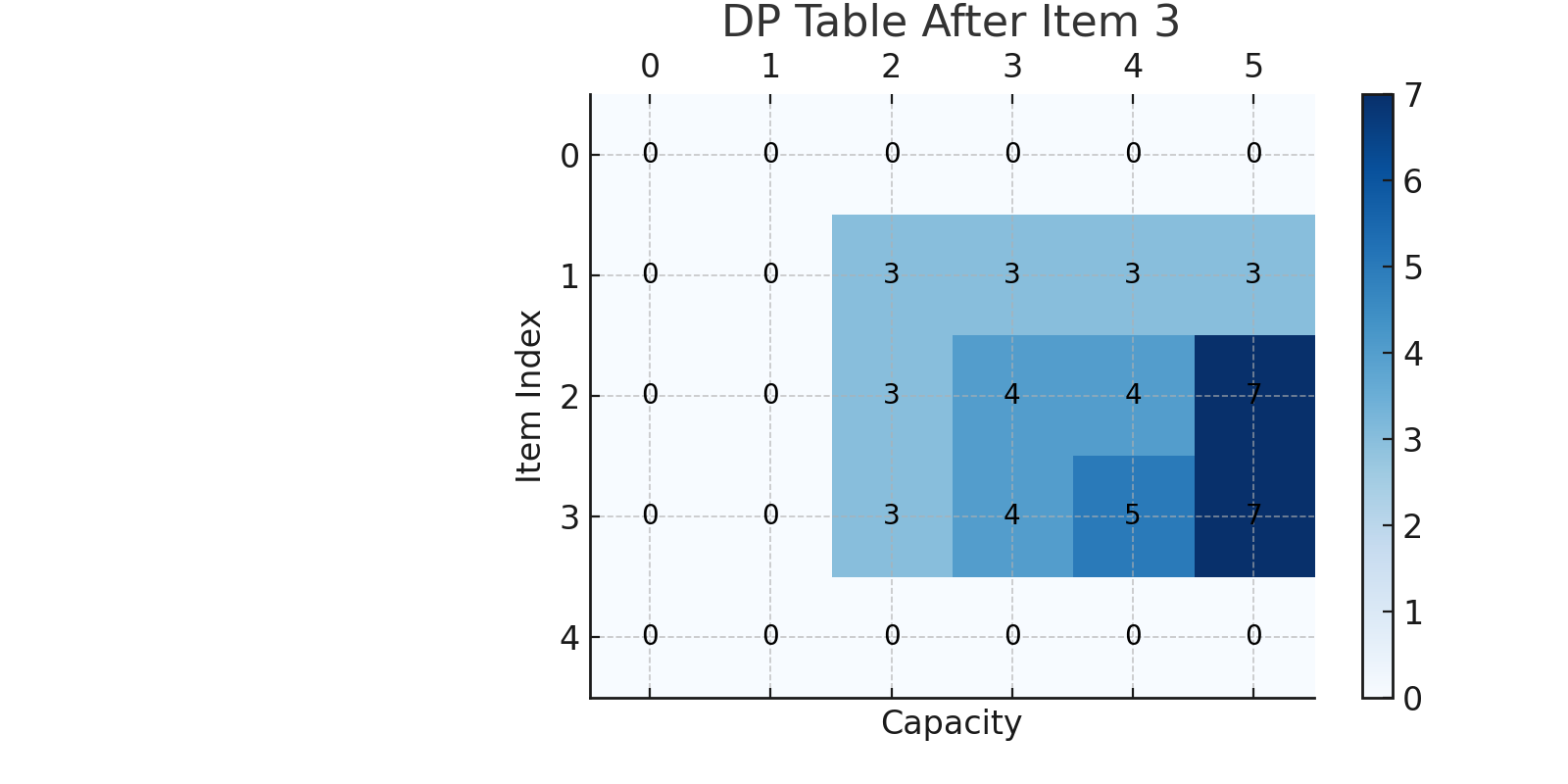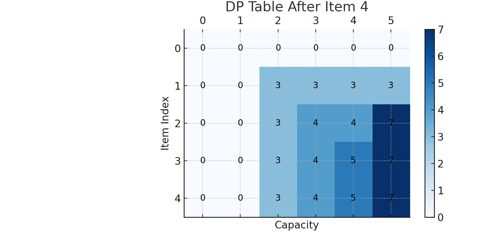 console.log(knapsack(weights, values, capacity)); // 출력: 7 (3+4)