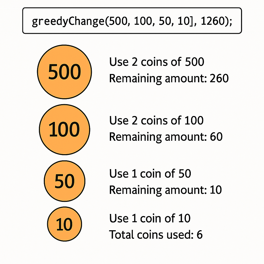 console.log(greedyChange([500, 100, 50, 10], 1260)); // 결과: 6