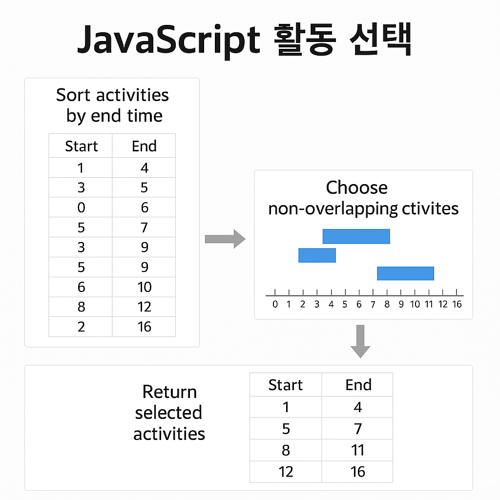 lastEnd를 초기화하고, 활동을 하나씩 확인하면서 이전 활동의 종료 시간 이후에 시작하는 경우만 선택합니다.- 선택된 활동들을 배열에 저장하여 반환합니다.